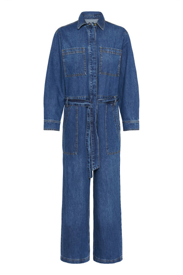OBS! Fjernlager. Levering kan blive forlænget med 2-3 dage, hvis varen ikke findes i vores butik lige nu.Smart denim jumpsuit fra InWear med lange ærmer, en lille krave i halsen og store lommer på brystet.Buksedragten har også et straight-leg snit, knaplukning langs fronten og et bredt bindebælte til taljen.