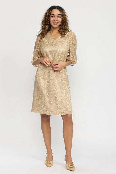 - OBS! Fjernlager. Levering kan blive forlænget med 2-3 dage, hvis varen ikke findes i vores butik lige nu.Smuk blondekjole fra 2-Biz med ¾ lange mesh ærmer, v-udskæring i halsen og et feminint snit.