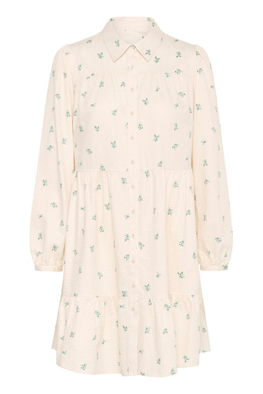 OBS! Fjernlager. Levering kan blive forlænget med 2-3 dage, hvis varen ikke findes i vores butik lige nu.Sød skjortekjole fra Part Two med lange ærmer, krave i halsen og knaplukning langs fronten. Kjolen har også et fint mini print og brede flæser i skørtet.