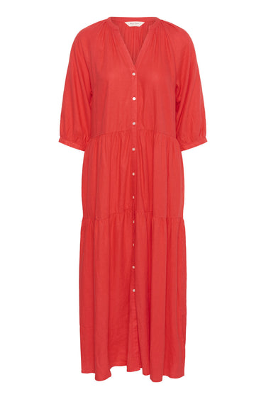 OBS! Fjernlager. Levering kan blive forlænget med 2-3 dage, hvis varen ikke findes i vores butik lige nu.Fin enkel kjole fra Part Two med ¾ lange ærmer, rund hals med v-udskæring og knaplukning langs fronten.