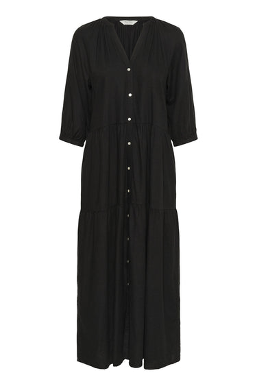 OBS! Fjernlager. Levering kan blive forlænget med 2-3 dage, hvis varen ikke findes i vores butik lige nu.Fin enkel kjole fra Part Two med ¾ lange ærmer, rund hals med v-udskæring og knaplukning langs fronten.