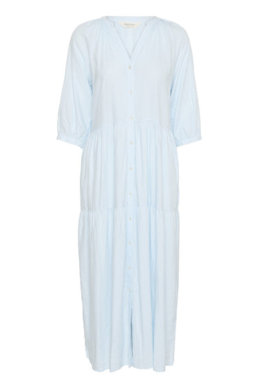 OBS! Fjernlager. Levering kan blive forlænget med 2-3 dage, hvis varen ikke findes i vores butik lige nu.Fin enkel kjole fra Part Two med ¾ lange ærmer, rund hals med v-udskæring og knaplukning langs fronten.