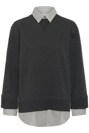 OBS! Fjernlager. Levering kan blive forlænget med 2-3 dage, hvis varen ikke findes i vores butik lige nu.Lækker sweatshirt fra InWear med lange ærmer, rund hals og en smart stribet skjorte indenunder.Skjorten har en klassisk spids krave i halsen og en afslappet silhuet.