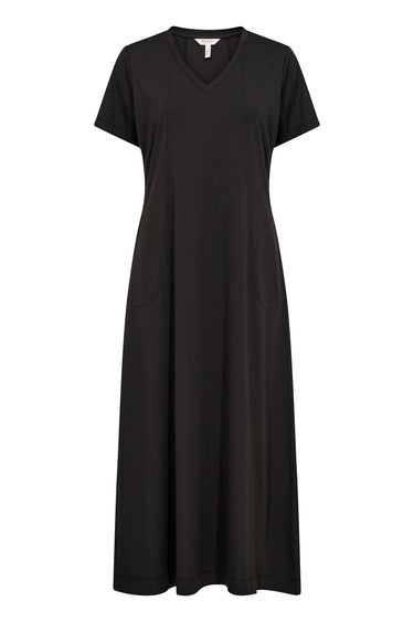 OBS! Fjernlager. Levering kan blive forlænget med 2-3 dage, hvis varen ikke findes i vores butik lige nu.Enkel kjole fra Part Two med korte ærmer, v-udskæring i halsen og et feminint snit.