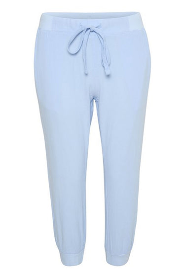 OBS! Fjernlager. Levering kan blive forlænget med 2-3 dage, hvis varen ikke findes i vores butik lige nu.Lækre capri bukser fra Kaffe med en bred elastikkant og bindesnor i taljen, elastikkanter i bunden af benene og en dejlig blød bomuldskvalitet.