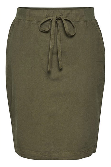 OBS! Fjernlager. Levering kan blive forlænget med 2-3 dage, hvis varen ikke findes i vores butik lige nu.Fin og enkel nederdel fra Kaffe med en bred elastikkant og bindesnor i taljen, lommer i siderne og små slidser.