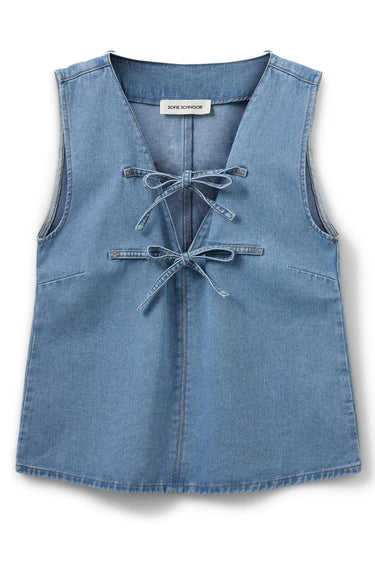- OBS! Fjernlager. Levering kan blive forlænget med 2-3 dage, hvis varen ikke findes i vores butik lige nu.Ærmeløs top fra Sofie Schnoor i lyseblåt denim med dyb V-udskæring og sløjfedetaljer foran. Toppen har et let a-formet snit og er fremstillet i en bomuldsblanding med polyester og viskose.