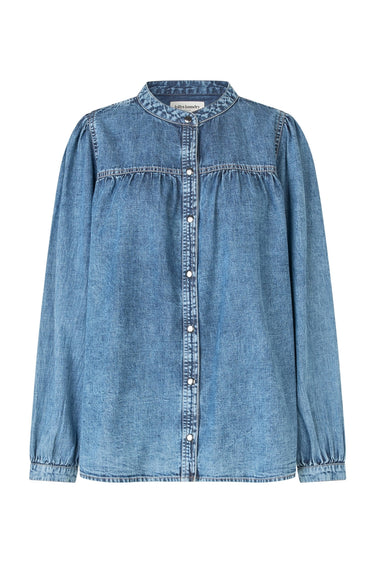 OBS! Fjernlager. Levering kan blive forlænget med 2-3 dage, hvis varen ikke findes i vores butik lige nu.Elegant denim skjorte fra Lollys Laundry med lange ærmer, kinakrave i halsen og knaplukning langs fronten.Skjorten har også en løs silhuet og små rynkeeffekter over brystet.