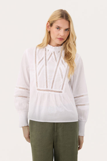 OBS! Fjernlager. Levering kan blive forlænget med 2-3 dage, hvis varen ikke findes i vores butik lige nu.Feminin bluse fra Part Two med lange ærmer, høj hals og super fine detaljer med tætsiddende smock manchetter og fine broderet paneler.