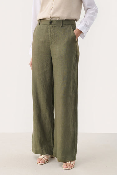 OBS! Fjernlager. Levering kan blive forlænget med 2-3 dage, hvis varen ikke findes i vores butik lige nu.Lækre hør bukser fra Part Two med vidde i benene, mid-rise talje og en dejlig let kvalitet.