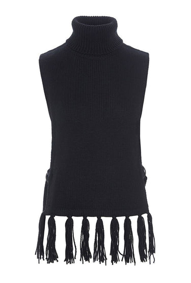 OBS! Fjernlager. Levering kan blive forlænget med 2-3 dage, hvis varen ikke findes i vores butik lige nu.En særdeles lækker og vamset vest med høj hals og frynser. Den er åbentstående i siderne, hvor stropper med spænder holder vesten sammen. Det giver et ponchoagtigt udtryk. Lad den højhalsede vest opgradere alt fra herrebukser til nederdel.