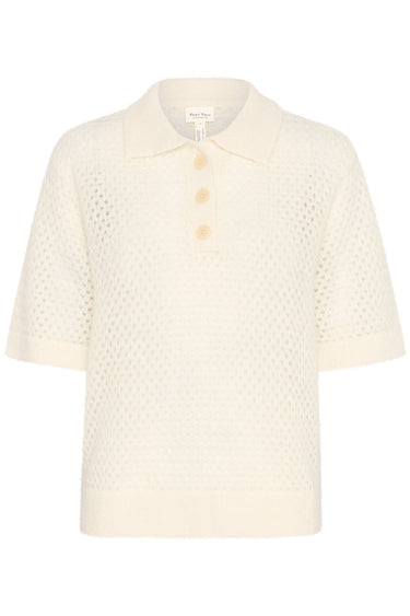 - OBS! Fjernlager. Levering kan blive forlænget med 2-3 dage, hvis varen ikke findes i vores butik lige nu.Fin strik fra Part Two med ½ lange ærmer, en blød krave i halsen og et kort knappanel over brystet.