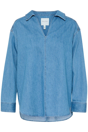 - OBS! Fjernlager. Levering kan blive forlænget med 2-3 dage, hvis varen ikke findes i vores butik lige nu.Smart oversized denim bluse fra Part Two med lange ærmer, v-udskæring med krave i halsen og et enkelt udtryk.