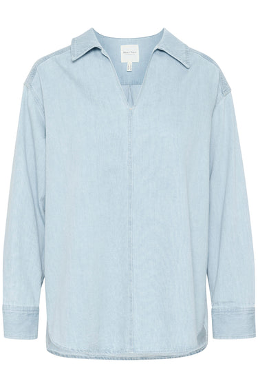 - OBS! Fjernlager. Levering kan blive forlænget med 2-3 dage, hvis varen ikke findes i vores butik lige nu.Smart oversized denim bluse fra Part Two med lange ærmer, v-udskæring med krave i halsen og et enkelt udtryk.