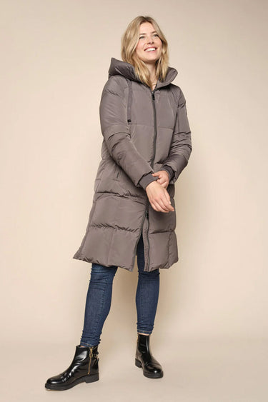 Dejlig varm lang dunjakke fra Mos Mosh. Jakken har en lækker lige pasform, lukkes med kraftig dobbelt lynlås, den har to lommer på fronten og en skøn hætte med snøre. Metaldetaljerne er i sølv.