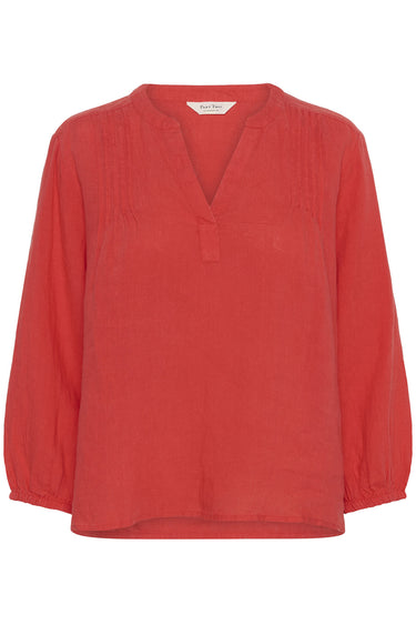 OBS! Fjernlager. Levering kan blive forlænget med 2-3 dage, hvis varen ikke findes i vores butik lige nu.Fin og enkel bluse fra Part Two med ¾ lange ærmer, rund hals med v-udskæring og fine plisseer omkring skulderne.