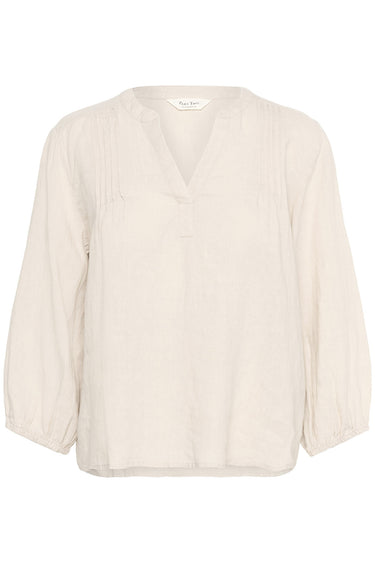 OBS! Fjernlager. Levering kan blive forlænget med 2-3 dage, hvis varen ikke findes i vores butik lige nu.Fin og enkel bluse fra Part Two med ¾ lange ærmer, rund hals med v-udskæring og fine plisseer omkring skulderne.
