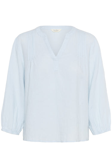 OBS! Fjernlager. Levering kan blive forlænget med 2-3 dage, hvis varen ikke findes i vores butik lige nu.Fin og enkel bluse fra Part Two med ¾ lange ærmer, rund hals med v-udskæring og fine plisseer omkring skulderne.