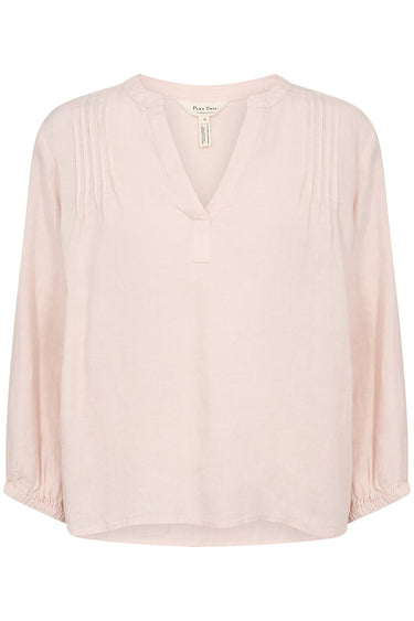 OBS! Fjernlager. Levering kan blive forlænget med 2-3 dage, hvis varen ikke findes i vores butik lige nu.Fin og enkel bluse fra Part Two med ¾ lange ærmer, rund hals med v-udskæring og fine plisseer omkring skulderne.