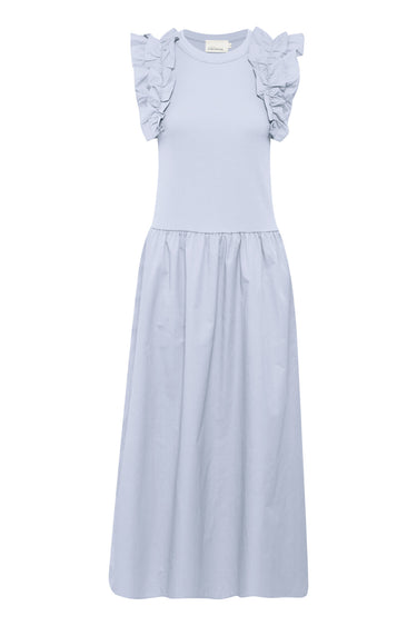 - OBS! Fjernlager. Levering kan blive forlænget med 2-3 dage, hvis varen ikke findes i vores butik lige nu.Flot kjole fra Karen By Simonsen med rund hals, skønne flæseærmer og et feminint snit.