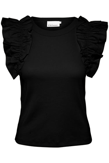 OBS! Fjernlager. Levering kan blive forlænget med 2-3 dage, hvis varen ikke findes i vores butik lige nu.Fin top fra Karen By Simonsen med rund hals og de skønneste flæseærmer.