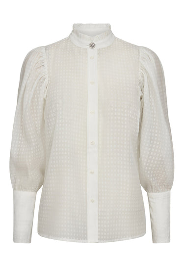 OBS! Fjernlager. Levering kan blive forlænget med 2-3 dage, hvis varen ikke findes i vores butik lige nu.Feminin skjortebluse fra Co'couture med lange pufærmer, brede tætsiddende manchetter og høj flæsekant i halsen.