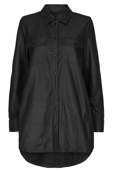 Flot oversize skindbluse fra Notyz med lange ærmer, krave i halsen og fine lommer på brystet. Den lukkes med trykknapper langs fronten og er lidt længere bagtil end foran.