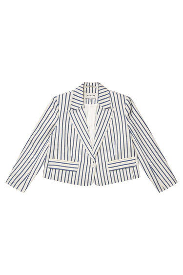 OBS! Fjernlager. Levering kan blive forlænget med 2-3 dage, hvis varen ikke findes i vores butik lige nu.Kort, elegant blazer fra Munthe designet med smukke blå striber. Blazeren har lige skuldre, lange ærmer, klaplommer og lukkes med en enkelt knap foran.