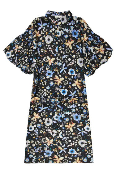 OBS! Fjernlager. Levering kan blive forlænget med 2-3 dage, hvis varen ikke findes i vores butik lige nu.Skjortekjole fra Munthe med et smukt all-over print, lavet af blomster Naja Munthe har plantet i sin egen have. Denne kjole er lavet af en blød silkeblanding og er designet så den kan åbnes halvvejs ned. Kjolen har brede puf ærmer og et elegant bælte som giver flere styling muligheder. Denne kjole kan styles med eller uden bælte.