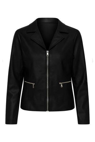 OBS! Fjernlager.Levering kan blive forlænget med 2-3 dage, hvis varen ikke findes i vores butik lige nu.Denne jakke fra 2-Biz med læderlook er både stilfuld og utrolig behagelig at have på. Den har en sølvfarvet lynlås foran og lynlåslommer, der tilføjer et elegant touch. Jakken er hoftekort og har smukke detaljer, herunder en krave ved halsen. Den er let faconsyet, hvilket fremhæver taljen på en flot måde.
