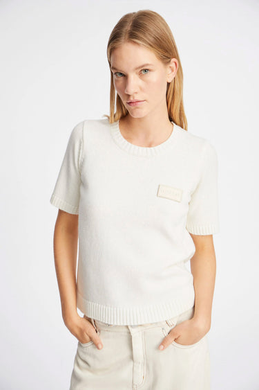 OBS! Fjernlager. Levering kan blive forlænget med 2-3 dage, hvis varen ikke findes i vores butik lige nu.Strik med en elegant MUNTHE logo patch på brystet. Denne strik har korte ærmer og er designet med en fin ribkant som afslutning.