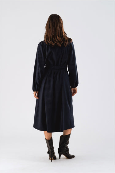 OBS! Fjernlager. Levering kan blive forlænget med 2-3 dage, hvis varen ikke findes i vores butik lige nu.Tidløs kjole fra Lollys Laundry med klassiske nålestriber og elegante detaljer. Den har en smal krave, V-udskæring og lange ærmer med elastiske manchetter for et afslappet, men raffineret look. Den brede, quiltede linning fremhæver silhuetten og kan tages af for en mere afslappet stemning.