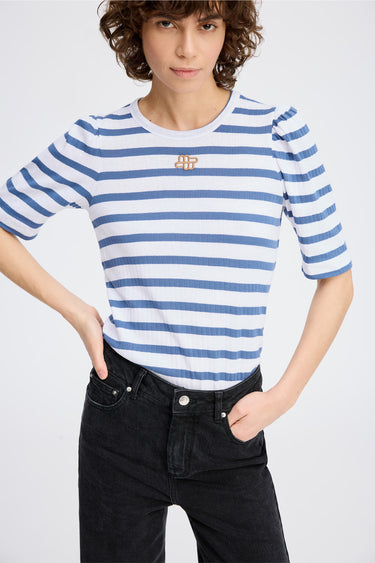 OBS! Fjernlager. Levering kan blive forlænget med 2-3 dage, hvis varen ikke findes i vores butik lige nu.Smart tee fra Munthe med ½ lange ærmer, rund hals og et lille broderet logo på brystet.