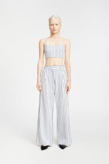 OBS! Fjernlager. Levering kan blive forlænget med 2-3 dage, hvis varen ikke findes i vores butik lige nu.Super flotte bukser fra Munthe med en smart detalje i taljen, store lommer i siderne og vidde i benene.Bukserne har også en afslappet silhuet, en dejlig blød kvalitet og et klassisk stribet print.