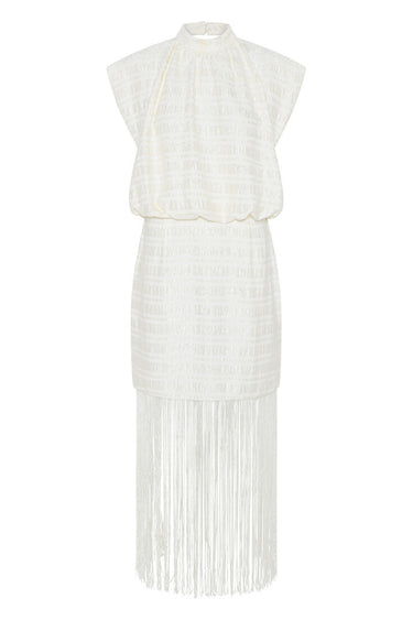- OBS! Fjernlager. Levering kan blive forlænget med 2-3 dage, hvis varen ikke findes i vores butik lige nu.Sofistikeret kjole fra Bruuns Bazaar med almindelig pasform og elegant frynsedetalje. Underdelen er designet som en almindelig nederdel med lynlås, og kjolen har knapper i V-ryggen og bag i nakken. Foer giver ekstra komfort.
