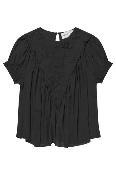 OBS! Fjernlager. Levering kan blive forlænget med 2-3 dage, hvis varen ikke findes i vores butik lige nu.Sød bluse fra Munthe med korte ærmer, rund hals og super fine V-formet flæsedetaljer over brystet.