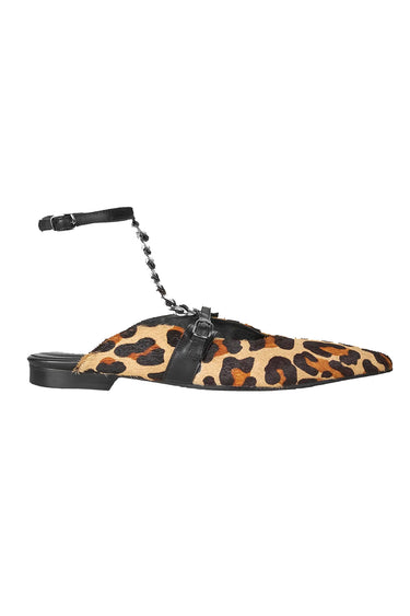 OBS! Fjernlager. Levering kan blive forlænget med 2-3 dage, hvis varen ikke findes i vores butik lige nu.Sko fra Munthe med et smukt leopardprint og en elegant kæde, der løber fra anklen til vristen. Skoen har en justerbar pasform omkring anklen ved hjælp af et lille spænde. Denne sko er designet med en åben hæl og er lavet af 100 % læder med en naturlig hårstruktur.