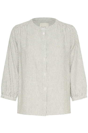 OBS! Fjernlager. Levering kan blive forlænget med 2-3 dage, hvis varen ikke findes i vores butik lige nu.Afslappet bluse fra Part Two med ¾ lange ærmer, kinakrave i halsen med knaplukning over brystet og et fint stribet print.