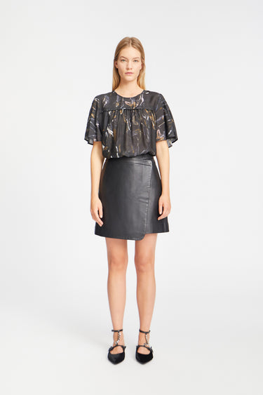 OBS! Fjernlager. Levering kan blive forlænget med 2-3 dage, hvis varen ikke findes i vores butik lige nu.Super fin top fra Munthe med korte flæseærmer, rund hals og flotte draperet effekter over brystet.