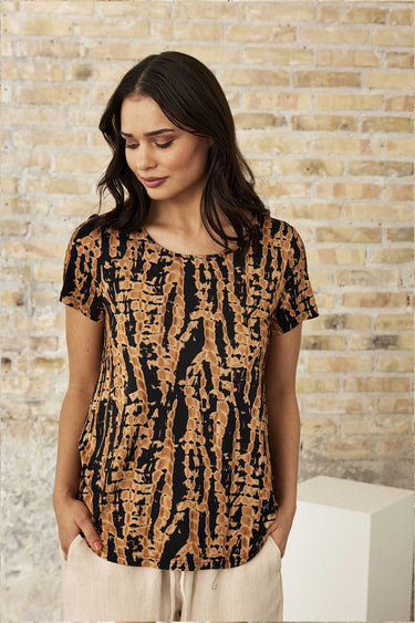 OBS! Fjernlager. Levering kan blive forlænget med 2-3 dage, hvis varen ikke findes i vores butik lige nu.Sød t-shirt fra In Front med korte ærmer, rund hals og et fint print.