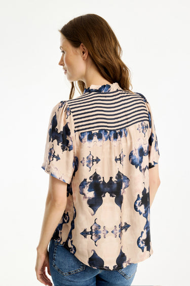 OBS! Fjernlager. Levering kan blive forlænget med 2-3 dage, hvis varen ikke findes i vores butik lige nu.Sød bluse fra In Front med korte ærmer, rund hals med v-udskæring og et fint print.