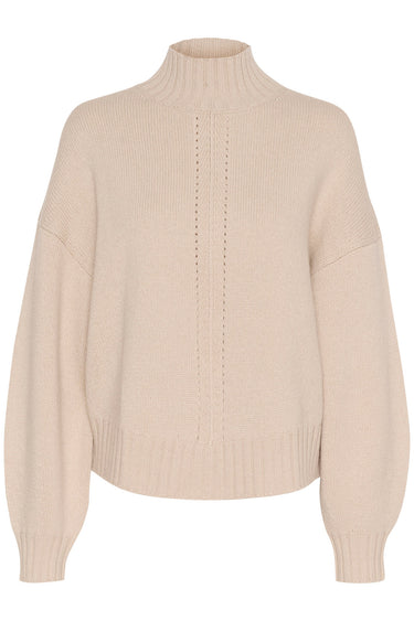 OBS! Fjernlager. Levering kan blive forlænget med 2-3 dage, hvis varen ikke findes i vores butik lige nu.Skøn strik fra Part Two med lange puffede ærmer, høj hals og et super fint mønster.