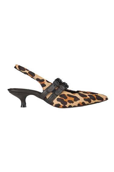 OBS! Fjernlager. Levering kan blive forlænget med 2-3 dage, hvis varen ikke findes i vores butik lige nu.Sko fra Munthe med en lille hæl og et elegant leopardprint. Skoen har en justerbar pasform omkring anklen med to fine spænder og en rem omkring hælen. Den er fremstillet af 100 % læder med en naturlig håroverflade.