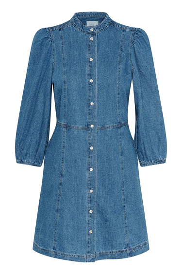 - OBS! Fjernlager. Levering kan blive forlænget med 2-3 dage, hvis varen ikke findes i vores butik lige nu.Feminin denim kjole fra Part Two med ¾ lange ærmer, kinakrave i halsen og knaplukning langs fronten.