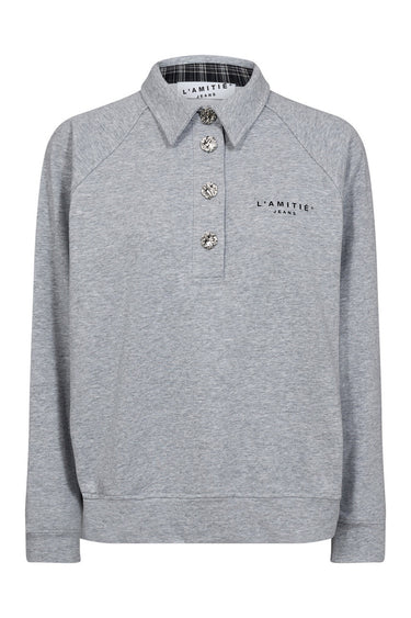 OBS! Fjernlager. Levering kan blive forlænget med 2-3 dage, hvis varen ikke findes i vores butik lige nu.Smart sweatshirt fra Haute L'amitié med lange ærmer, en lille krave i halsen og et kort knappanel over brystet.