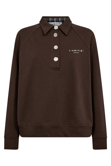 OBS! Fjernlager. Levering kan blive forlænget med 2-3 dage, hvis varen ikke findes i vores butik lige nu.Smart sweatshirt fra Haute L'amitié med lange ærmer, en lille krave i halsen og et kort knappanel over brystet.