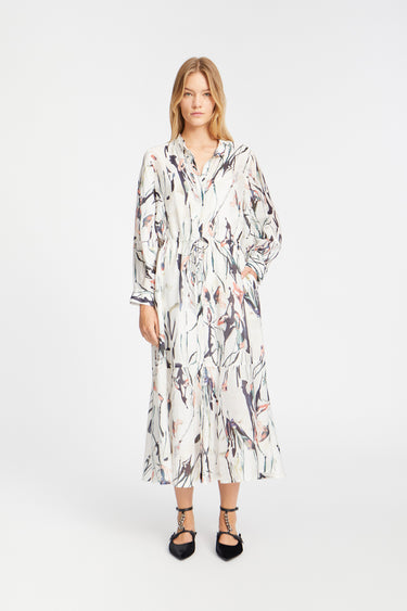 OBS! Fjernlager. Levering kan blive forlænget med 2-3 dage, hvis varen ikke findes i vores butik lige nu.Smuk kjole fra Munthe med lange ærmer, kinakrave i halsen og skjult knaplukning langs fronten.Kjolen har også et smalt bindebånd i taljen, en bred flæsekant i bunden af skørtet og et smukt abstrakt print.