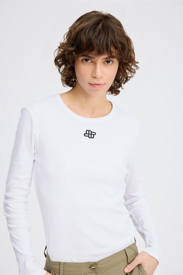 OBS! Fjernlager. Levering kan blive forlænget med 2-3 dage, hvis varen ikke findes i vores butik lige nu.Smart tee fra Munthe med lange ærmer, rund hals og et lille broderet logo på brystet.