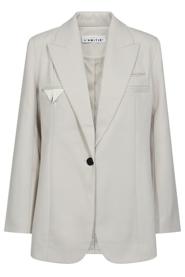 OBS! Fjernlager. Levering kan blive forlænget med 2-3 dage, hvis varen ikke findes i vores butik lige nu.Smuk blazer fra Haute L'Amitie med lange ærmer, en bred krave i halsen og et enkelt udtryk med en enkelt knap i fronten.