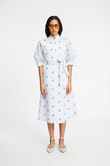 OBS! Fjernlager. Levering kan blive forlænget med 2-3 dage, hvis varen ikke findes i vores butik lige nu.Elegant slå-om kjole fra Munthe med ½ lange pufærmer, et bredt bindebælte i siden og et super flot print. Kjolen har også lommer i siderne og et feminint udtryk.